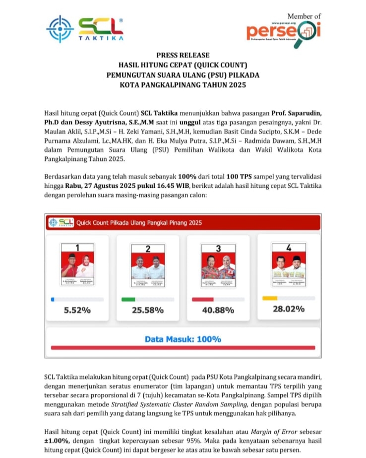 PANGKALPINANG – Lembaga survei SCL Taktika merilis hasil hitung cepat (quick count) Pemungutan Suara Ulang (PSU) Pemilihan Wali Kota dan Wakil Wali Kota Pangkalpinang Tahun 2025. Berdasarkan 100 persen data yang masuk dari 100 TPS sampel terverifikasi hingga Rabu (27/8/2025) pukul 16.45 WIB, pasangan Prof. Saparudin, Ph.D – Dessy Ayutrisna, S.E., M.M. sementara unggul atas tiga pasangan lainnya.