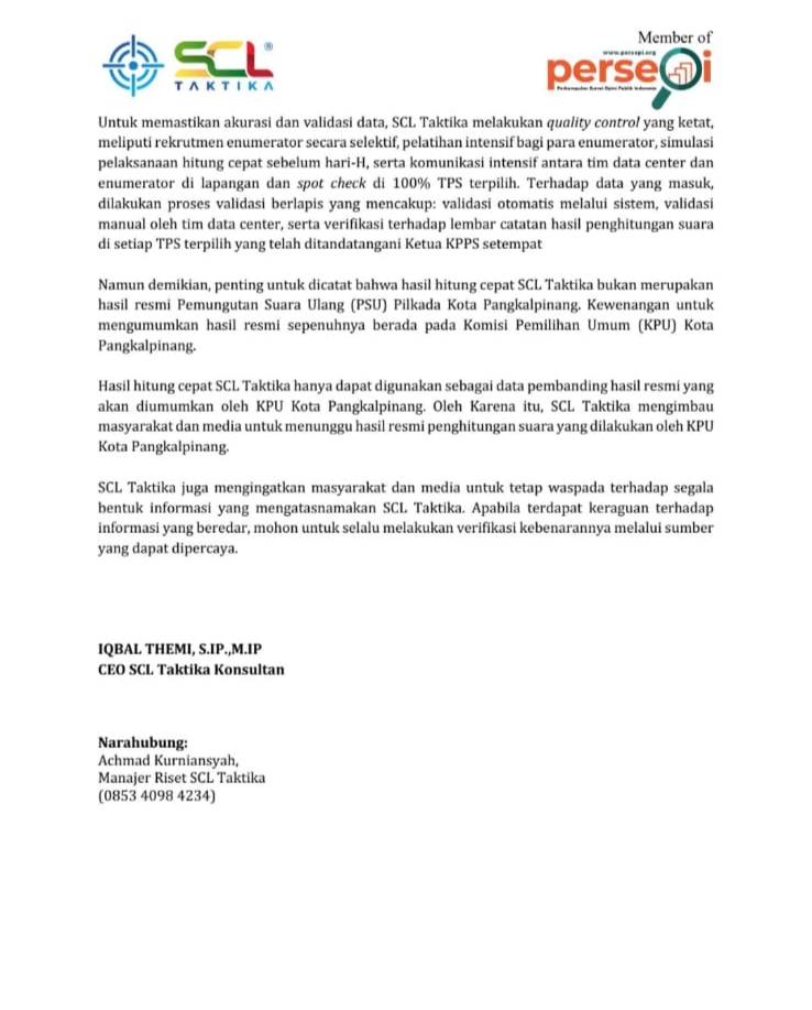 CEO SCL Taktika, Iqbal Themi, menegaskan bahwa hasil quick count ini bukanlah hasil resmi Pemungutan Suara Ulang (PSU) Pilkada Kota Pangkalpinang. Kewenangan penuh untuk menetapkan hasil resmi sepenuhnya berada di tangan Komisi Pemilihan Umum (KPU) Kota Pangkalpinang.