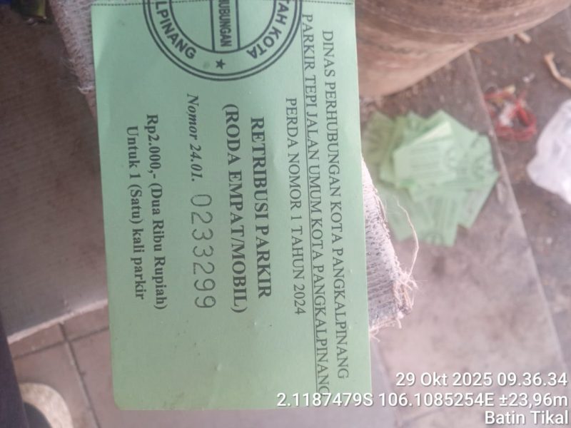 Karcis berwarna hijau muda bertuliskan “Retribusi Parkir Roda Empat – Dinas Perhubungan Kota Pangkalpinang” dengan tarif Rp2.000 per sekali parkir itu tercatat mengacu pada Perda Nomor 1 Tahun 2024. Namun, puluhan lembar tersebut justru ditemukan terbuang di area pasar yang setiap hari dipadati kendaraan dan pengunjung.