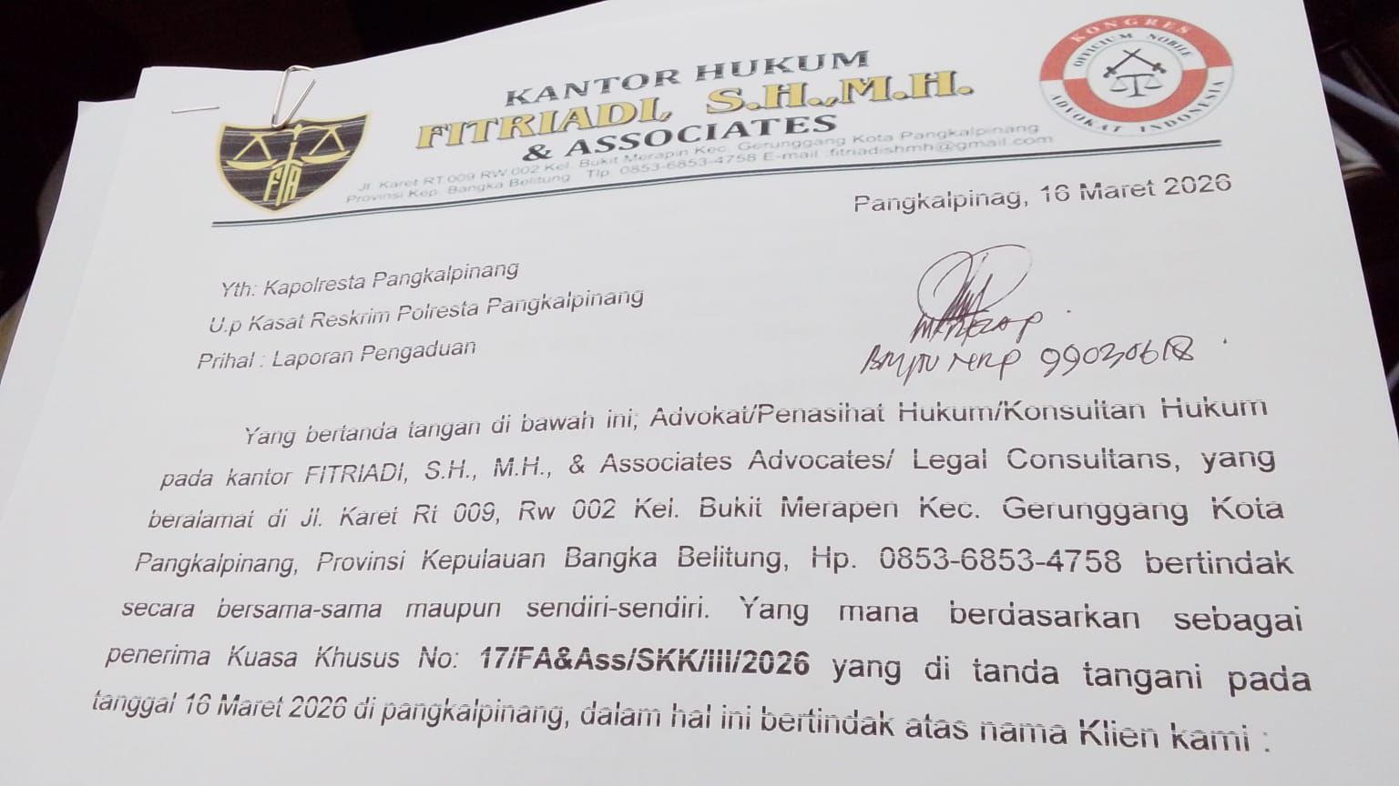 Laporan tersebut telah diterima oleh pihak kepolisian di Polresta Pangkalpinang setelah muncul dugaan intimidasi menggunakan isu Laporan Harta Kekayaan Penyelenggara Negara (LHKPN).