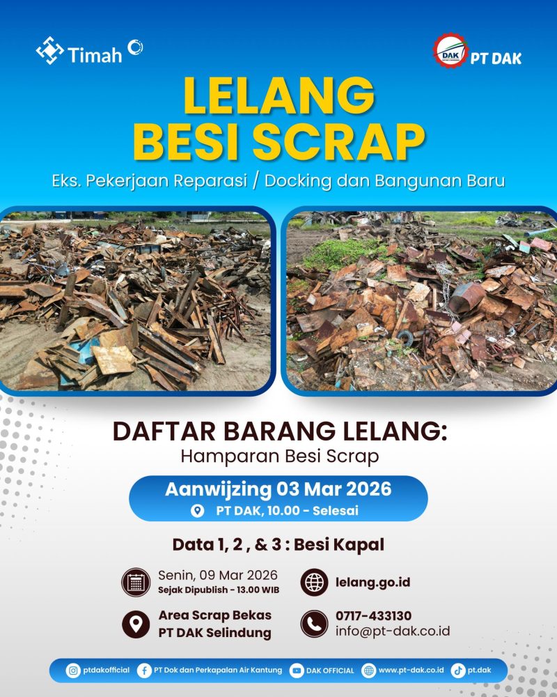 Pangkalpinang – Perusahaan galangan kapal PT Dok dan Perkapalan Air Kantung (PT DAK) mengumumkan pelaksanaan lelang besi scrap hasil pekerjaan reparasi, docking, dan pembangunan baru.